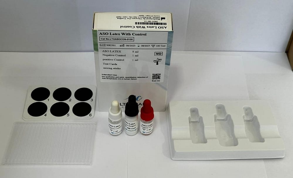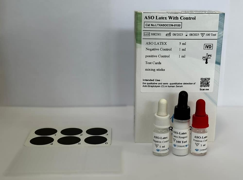 Ultracare ASO Latex is a rapid latex agglutination slide test for the detection and semi-quantitation of Anti-Streptolysin O (ASO) antibodies in human serum. It is used as an aid in diagnosing streptococcal infections and related complications.